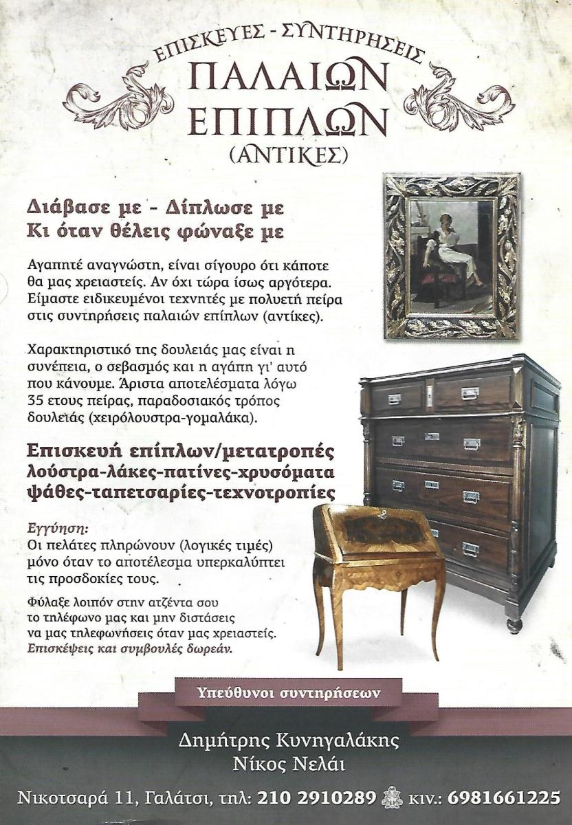 ΚΥΝΗΓΑΛΑΚΗΣ ΔΗΜΗΤΡΙΟΣ -ΕΠΙΣΚΕΥΕΣ ΠΑΛΑΙΩΝ ΕΠΙΠΛΩΝ ΨΥΧΙΚΟ - ΤΑΠΕΤΣΑΡΙΕΣ ΕΠΙΠΛΩΝ ΨΥΧΙΚΟ - ΛΑΚΕΣ ΕΠΙΠΛΩΝ